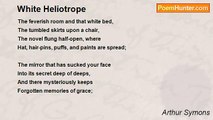 The feverish room and that white bed, <br />The tumbled skirts upon a chair, <br />The novel flung half-open where <br />Hat, hair-pins, puffs, and paints, are spread; <br /> <br />The mirror that has sucked your face <br />Into its secret deep of deeps, <br />And there mysteriously keeps <br />Forgotten memories of grace; <br /> <br />And you, half-dressed and half awake, <br />Your slant eyes strangely watching me, <br />And I, who watch you drowsily, <br />With eyes that, having slept not, ache; <br /> <br />This (need one dread? nay, dare one hope?) <br />Will rise, a ghost of memory, if <br />Ever again my handkerchief <br />Is scented with White Heliotrope.<br /><br />Arthur Symons<br /><br />http://www.poemhunter.com/poem/white-heliotrope-2/