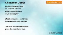 At night Chinamen jump <br />on Asia with a thump <br /> <br />while in our willful way <br />we, in secret, play <br /> <br />affectionate games and bruise <br />our knees like China's shoes. <br /> <br />The birds push apples through <br />grass the moon turns blue, <br /> <br />these apples roll beneath <br />our buttocks like a heath <br /> <br />full of Chinese thrushes <br />flushed from China's bushes. <br /> <br />As we love at night <br />birds sing out of sight, <br /> <br />Chinese rhythms beat <br />through us in our heat, <br /> <br />the apples and the birds <br />move us like soft words, <br /> <br />we couple in the grace <br />of that mysterious race.<br /><br />Frank O'Hara<br /><br />http://www.poemhunter.com/poem/at-night-chinamen-jump-2/