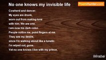 The earth looked at Him and began to dance. <br />Mira knows why, for her soul too <br />is in love. <br /> <br />If you cannot picture God <br />in a way that always <br />strengthens <br />you, <br /> <br />You need to read <br />more of my <br />poems <br /> <br />[Translated by Daniel Ladinsky]<br /><br />Mirabai<br /><br />http://www.poemhunter.com/poem/mira-knows-why/
