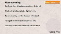 Memory, buried hope <br /> <br />Is preserved by this brown timber, <br /> <br />Dahlias hang over it <br /> <br />Ever more silent homecoming, <br /> <br />The dark reflection of childish years <br /> <br />By the decayed garden, <br /> <br />That tears fall from blue eyelids <br /> <br />Irresistibly; <br /> <br />Gloom's crystalline minutes <br /> <br />Gleam over <br /> <br />To the night.<br /><br />Georg Trakl<br /><br />http://www.poemhunter.com/poem/autumnal-homecoming/