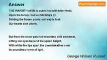 THE EAST was crowned with snow-cold bloom <br />And hung with veils of pearly fleece: <br />They died away into the gloom, <br />Vistas of peace—and deeper peace. <br /> <br /> <br />And earth and air and wave and fire <br />In awe and breathless silence stood; <br />For One who passed into their choir <br />Linked them in mystic brotherhood. <br /> <br /> <br />Twilight of amethyst, amid <br />Thy few strange stars that lit the heights, <br />Where was the secret spirit hid? <br />Where was Thy place, O Light of Lights? <br /> <br /> <br />The flame of Beauty far in space— <br />Where rose the fire: in Thee? in Me? <br />Which bowed the elemental race <br />To adoration silently?<br /><br />George William Russell<br /><br />http://www.poemhunter.com/poem/oversoul/