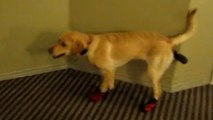 Un chien essaie de marcher avec des chaussures