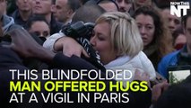 Blindfolded Muslim man hugs mourners in Paris