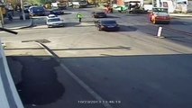 Man on motorcycle hit by runaway car tire on a Russian road
