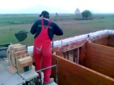 Polish builders working faster throwing shovels of mortar... Great brickwork technic!!