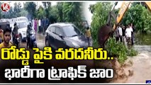 Huge Traffic Jam Due To Ibrahimpatnam Pedda Cheruvu Flood Water Inflow Ranga Reddy | V6 News