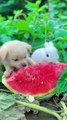 Dog and Rabbit Eating watermelon