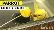 'Cute parrot chats with his toy duck while taking a bath'