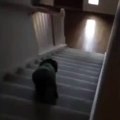 Scared dog falls down stairs at tuba sound