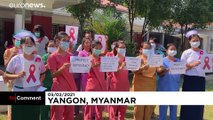 Red ribbons: Myanmar students, civil servants protest military coup