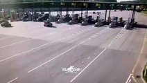 Car fails to see toll station in time and crashes into it.
