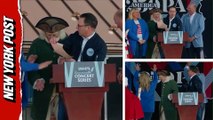 Gov. Shapiro Nearly Hit By America 250 Backdrop While Flanked by Betsy Ross, Ben Franklin
