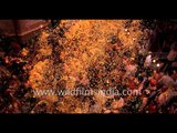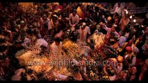 Holi festival known as festival of colours is played in a very different style in Vrindavan. It is a unique style were flower petals are used in place of colours.<br /><br />Artists dressed as Lord Krishna and his consort Radha are showered with rose petals during Holi celebrations in the northern Indian city of Vrindavan.<br /><br />A long forgotten tradition of playing Holi with flowers, brought alive at Keshi ghat, Vrindawan. People threw petals of marigold, jasmine and chrysanthemums on each other. <br /><br />People from all corners of India, rather, world gather at Mathura-Vrindavan every year to feel the essence of Holi in the land of Krishna. People relive the legends of Holi associated with Radha and Krishna and play pranks the young Krishna played with the cowgirls called gopis. The underlying feeling of this fun-frolic was love and devotion. Even today, romance can be experienced in the very atmosphere in the Krishna-nagari. One just needs to breathe in this air and drench oneself in the feeling of love and romance. Myriad colours of Holi are simply a facade on this. <br /><br />Keshi Ghat is the principal bathing place in the town of Vrindavan. It is little east of Chir-ghat on the banks of the Yamuna. Keshi Ghat is one of the most beautiful ghats of Yamuna with stone inlaid palaces on the banks and massive Madanmohan temple visible in the backdrop. Here the sacred river Yamuna flows very graciously and extends herself to everyone without discrimination. Anyone who touches, drinks, sees, smells and bathes in her waters become infinitely purified. This ghat (series of steps leading down to a water body) is named after the pastime of Lord Krishna killing the demon Keshi.<br /><br />Source : http://www.holifestival.org & http://www.iskcondesiretree.com<br /><br />This footage is part of the professionally-shot broadcast stock footage archive of Wilderness Films India Ltd., the largest collection of HD imagery from South Asia. The Wilderness Films India collection comprises of 50, 000+ hours of high quality broadcas