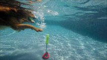 Golden Retrievers jump in and dive underwater for toys