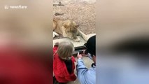 Lion tries to attack girl through glass