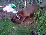 Cute dog gets stuck digging hole
