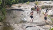 Boy slides into trouble during natural slide adventure, colliding with large rock