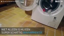 Minivarken haalt schone kleren uit wasmachine!