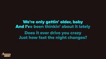 One Direction - Night Changes (Karaoke Version) <br />"Night Changes" <br /> <br />[Zayn:] <br />Going out tonight <br />Changes into something red <br />Her mother doesn't like that kind of dress <br />Everything she never had she's showing off <br /> <br />[Liam:] <br />Driving too fast <br />Moon is breaking through her hair <br />She's heading for something that she won't forget <br />Having no regrets is all that she really wants <br /> <br />[Harry:] <br />We're only getting older, baby <br />And I been thinking about it lately <br />Does it ever drive you crazy <br />Just how fast the night changes? <br />Everything that you've ever dreamed of <br />Disappearing when you wake up <br />But there's nothing to be afraid of <br />Even when the night changes <br />It will never change me and you <br /> <br />[Louis:] <br />Chasing it tonight, <br />Doubts are running 'round her head <br />He's waiting, hides behind a cigarette <br />Heart is beating loud, and she doesn't want it to stop <br /> <br />[Niall:] <br />Moving too fast <br />Moon is lighting up her skin <br />She's falling, doesn't even know it yet <br />Having no regrets is all that she really wants <br /> <br />[Harry:] <br />We're only getting older, baby <br />And I been thinking about it lately <br />Does it ever drive you crazy <br />Just how fast the night changes? <br />Everything that you've ever dreamed of <br />Disappearing when you wake up <br />But there's nothing to be afraid of <br />Even when the night changes <br />It will never change me and you <br /> <br />[Zayn:] <br />Going out tonight <br />Changes into something red <br />Her mother doesn't like that kind of dress <br />Reminds her of the missing piece of innocence she lost <br /> <br />[Harry (along all):] <br />We're only getting older, baby <br />And I been thinking about it lately <br />Does it ever drive you crazy <br />Just how fast the night changes? <br />Everything that you've ever dreamed of <br />Disappearing when you wake up <br />But there's nothing to be afraid of <br />Even when the night changes <br />It will never change, baby <br />It will never change, baby <br />It will never change me and you