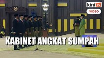 Menteri Perdagangan Dalam Negeri, Koperasi dan Kepenggunaan Datuk Hamzah Zainudin hari ini mendahului barisan menteri dan timbalan menteri mengangkat sumpah jawatan dan setia serta sumpah simpan rahsia di hadapan Yang di-Pertuan Agong Tuanku Abdul Halim Mu'adzam Shah.<br /><br />Upacara itu berlangsung di Bilik Singgahsana Kecil, Istana Negara pada jam 10 pagi dan dikuti dengan majlis menandatangani dokumen rasmi pelantikan yang disaksikan oleh Ketua Hakim Negara Tun Arifin Zakaria dan Ketua Setiausaha Negara Tan Sri Ali Hamsa.