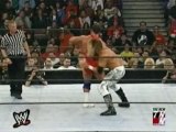 WWE - Kurt Angle belly to belly suplexes HHH off one table o
