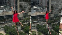 'Brazilian yoga trainer & athlete walks a highline above a São Paulo street '
