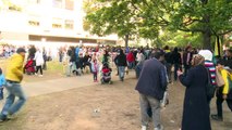 Hundreds of refugees and migrants wait in line in front of the main registration centre for asylum seekers in Berlin while many NGOs provide them with food and water.
