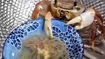 Un crabe mange des nouilles