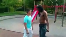 Funny Video: Giant Bully Takes a Dirt Nap.<br>David vs Goliath fight footage shows big bully getting knocked spark out by plucky victim.<br>The bigger they are, the harder they fall!<br>Funny,comic,fail,accident,knockout vdeos.