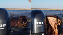 Charging hippo bites tourist boat’s rear motor in furious chase