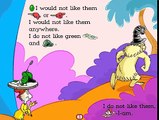 One sunny morning, Sam-I-Am pesters his friend Joey to eat a breakfast food called green eggs and ham. Joey tells him that he doesn't like that food. Sam continues to ask Joey if he'd eat that food in eight various locations (house, box, car, tree, train, dark, rain, and boat) and Sam's three animals (mouse, fox, and goat). After getting put over the edge about it, Joey finally chooses to give them a try in pleading that Sam-I-Am would leave him alone. He takes a bite of the dish, and he is surprised to find that he does like them after all, and he will eat them in all the places Sam-I-Am just asked about. The story has ended with Sam-I-Am and Joey becoming friends.