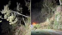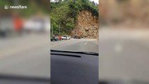 Footage has emerged of the moment landslides blocked a country road in a mountainous part of China's Sichuan Province.<br /> <br />The video, captured by a bystander two weeks ago, shows stones and earth rolling down towards the entrance of a tunnel with massive dust temporarily covering the view.<br /> <br />No injuries were reported, according to local media.