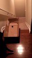 Il place un carton en équilibre en haut d'un escalier et pointe un laser dessus pour que ses chats fassent un petit tour de manège. Hobbes, un des chats, est un peu trop curieux et va se avoir en entrant dans le carton. La boîte va basculer et dévaler les marches de l'escalier. Rassurez-vous, Hobbes n'a pas été blessé et a remonté aussitôt l'escalier pour faire un autre tour.