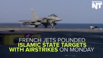 French jets struck the heart of ISIS-controlled territory on Sunday in the first direct retaliation for Friday's terror attacks that killed at least 129 people in Paris.<br />Twelve aircraft, including 10 French fighter jets, dropped 20 bombs on a command and control center, a jihadi recruitment center, munitions depot and ISIS training camp in the Syrian city of Raqqa, France's Defense Ministry said in a statement.<br />Raqqa is the de facto capital of the Islamic State's "caliphate."<br />The "massive" raid was launched from the United Arab Emirates and Jordan and was carried out in coordination with U.S. forces.<br />A Pentagon source told Fox News, "these were French strikes but they were conducted within the coalition.<br />We helped with the target list."