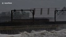 Storm Desmond batters the Ayrshire coast in Scotland at high tide, with strong winds causing the waves to fly over the sea wall.