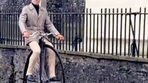 Man rides a vintage high wheeler through the street like a time traveler