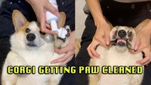 'Patient Corgi Getting its Paws Cleaned *ADORABLE*'