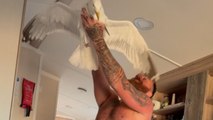 Man scares his wife with a seagull that landed in his hands