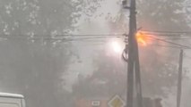 Dramatic footage of electric pole explosion amid intense rainfall