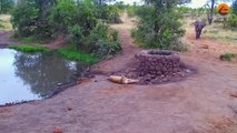 Elephant Sprays Water at Lion