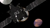 The journey that the ExoMars 2016 spacecraft will take from Earth to Mars. 'Distance to Mars' is the straight-line distance between the spacecraft and Mars, and not the actual distance that the spacecraft will travel.The mission is scheduled for launch in the 14–25 March window. The Trace Gas Orbiter and the Schiaparelli entry, descent and landing demonstrator module will separate on 16 October. Schiaparelli is set to enter the martian atmosphere on 19 October, while TGO will enter orbit around Mars.