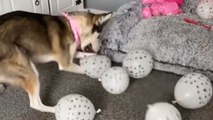 Lovely dog enjoys her lively second birthday by popping balloons one by one