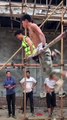 young villager boy amazing gymnastic in village front of villager .