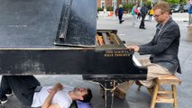 NYC busker invites people to lie under his piano to be immersed in music