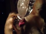 Dog drink out of water bottle