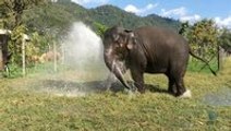 Elephant breaks sprinkler and makes their own fountain <br /> <br />Faa Sai at Elephant Nature Park thinks that sprinkler pressure in the field is not strong enough. She break the pipe and makes their own fountain and enjoy her dancing.