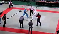 When you don't obey referee in Karate <br />Description: After first round of fight referee signals these fellows to stop. However, they didn't stop. This made referee angry and referee get in fight and beat the two fighters.