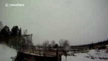 This is what happens when you use a bungee cord to propel someone off a ski jump