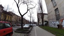 Taksist od iza bicikla i žuri pretjecati - između motora koji skreće lijevo i bicikla koji ide ravno, dakle, s jako malo prostora - iako jasno vidi da bicikl ide ravno (jer nije prošao kroz ranije zeleno svjetlo za skretanje desno), da bi blokirao bicikl 2 metra dalje zbog pješačkog prometa.