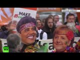 Thousands of opponents of a proposed transatlantic trade deal pour onto the streets of the German city of Hanover on the eve of a visit by US President Barack Obama.